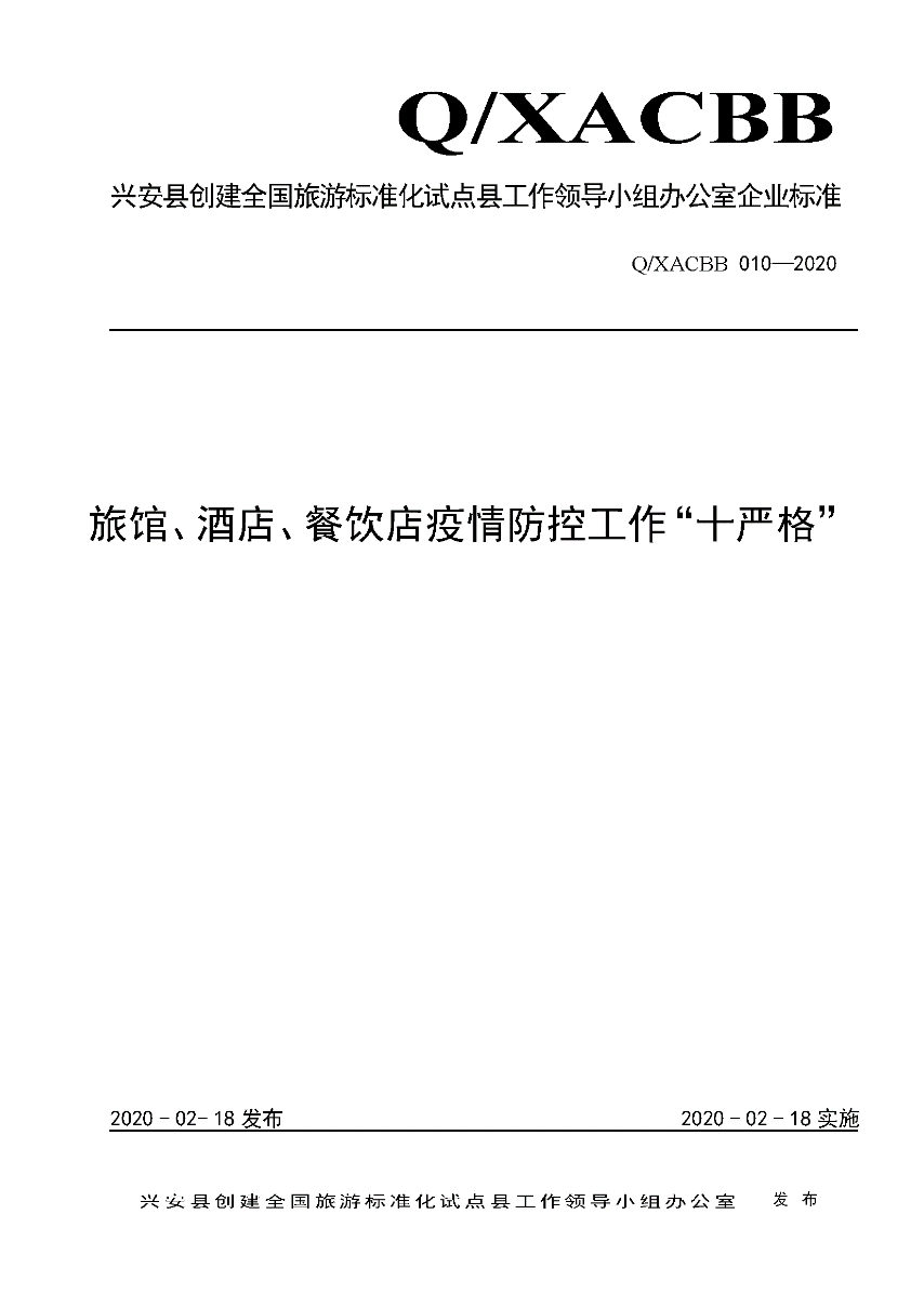 为应对2020年初全国爆发的新冠肺炎疫情,兴安县创建全国旅游标准化试点县工作领导小组办公室针对各服务行业制定出台了《车站、渡口及公共交通工具疫情防控工作“十严格”》、《餐饮服务业疫情防控管理规范》、《旅馆、酒店、餐饮店疫情防控工作“十严格”》等7项疫情防控相关县级标准规范,为包含17类52家标准化试点企业在内的兴安县旅游企业的疫情防控提供了高效的防控标准,为兴安县的旅游业复工复产提供了安全保障。