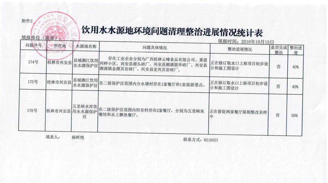 兴安县饮用水水源地环境问题清理整治进展情况统计(10月)