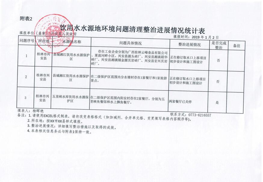 兴安县饮用水水源地环境问题清理整治进展情况统计(2019年1月)