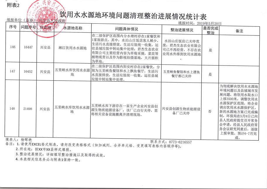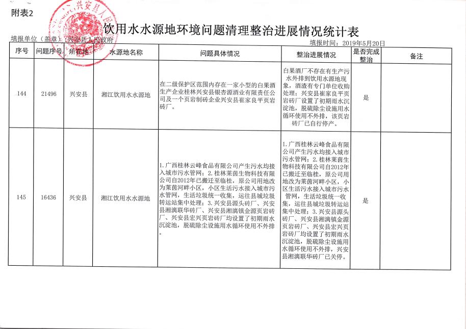 兴安县饮用水水源地环境问题清理整治进展情况统计(2019年5月)