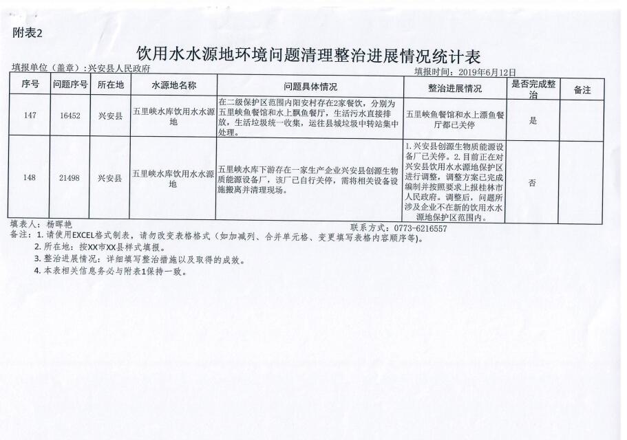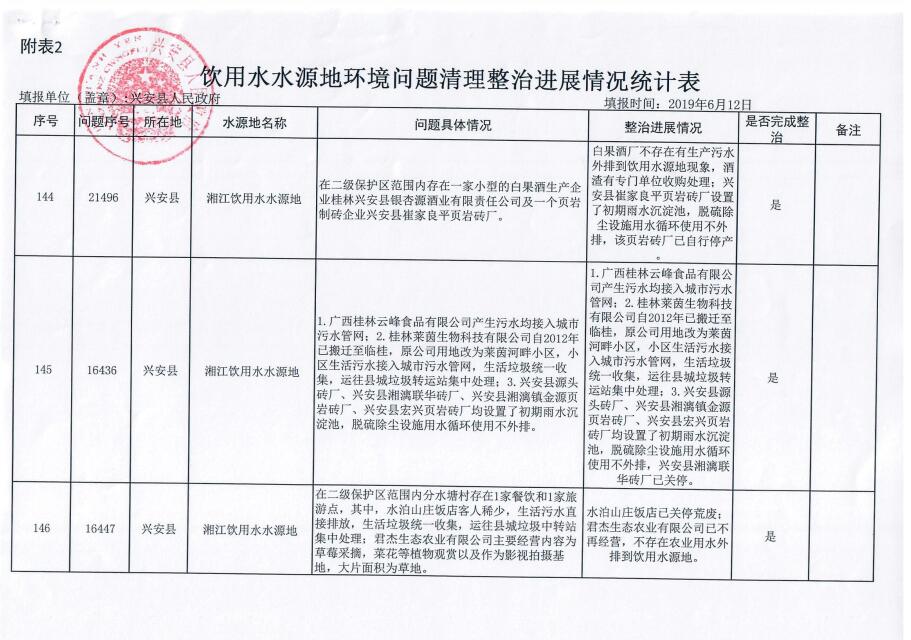 兴安县饮用水水源地环境问题清理整治进展情况统计(2019年6月)