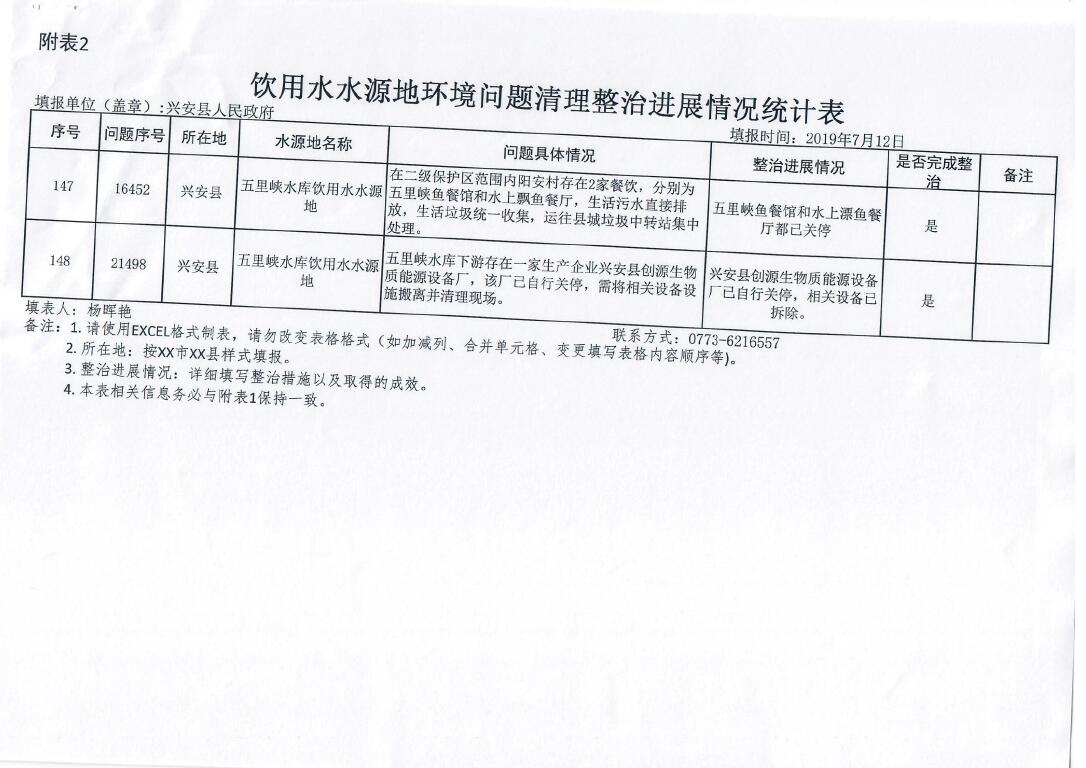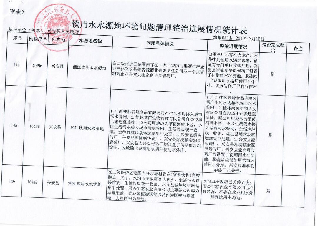 兴安县饮用水水源地环境问题清理整治进展情况统计(2019年7月)