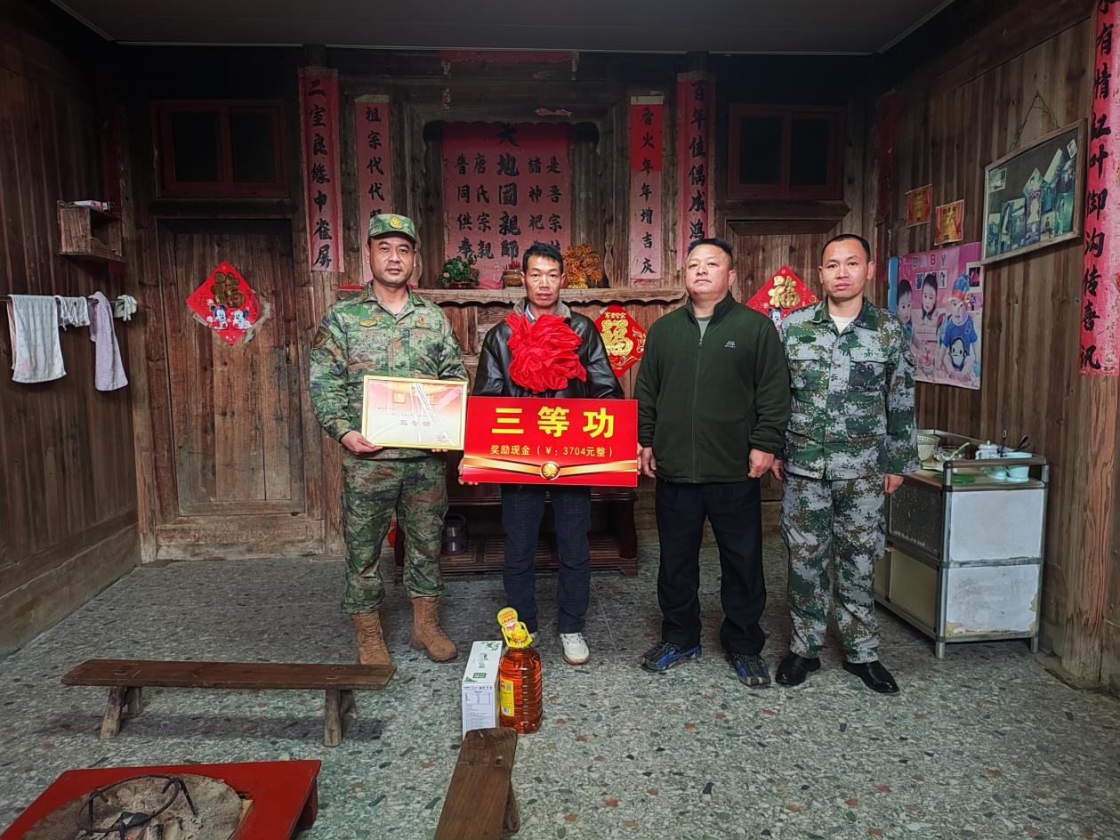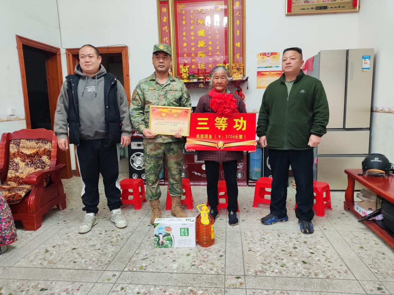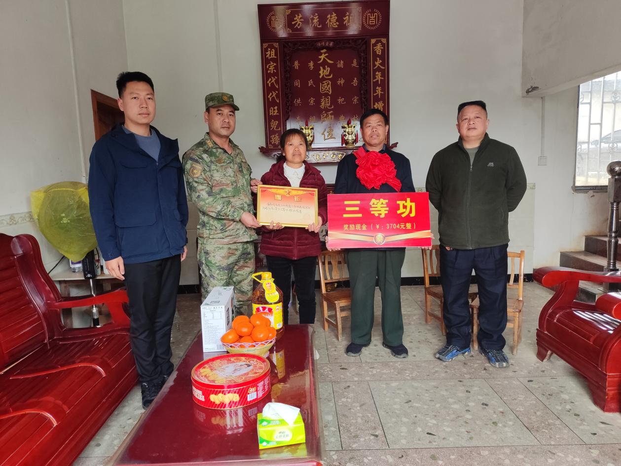 到湘漓镇普头村委现役军人文陆俊家中送立功喜报