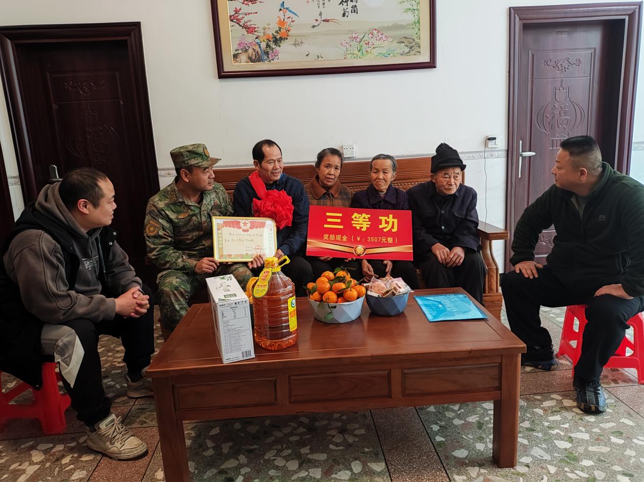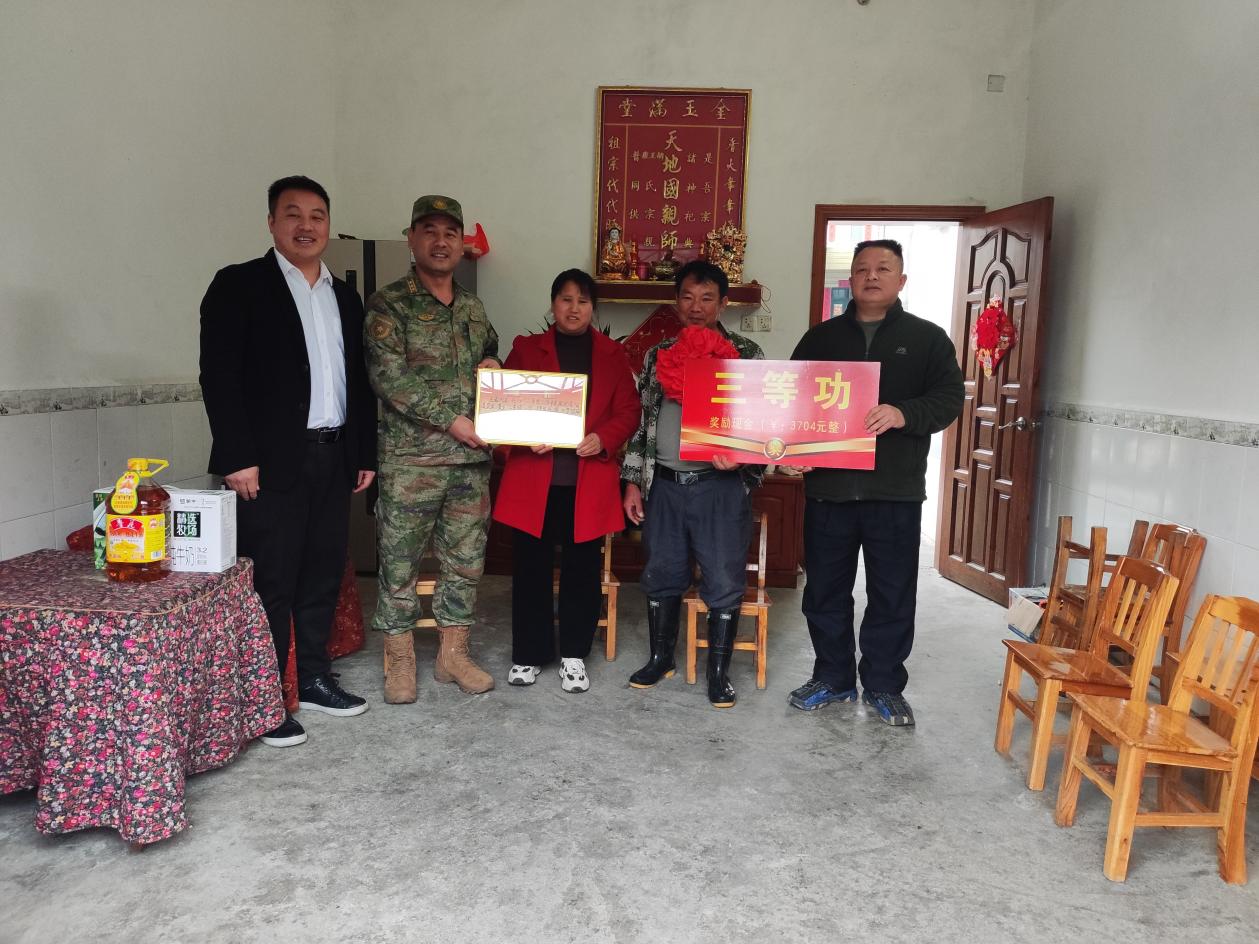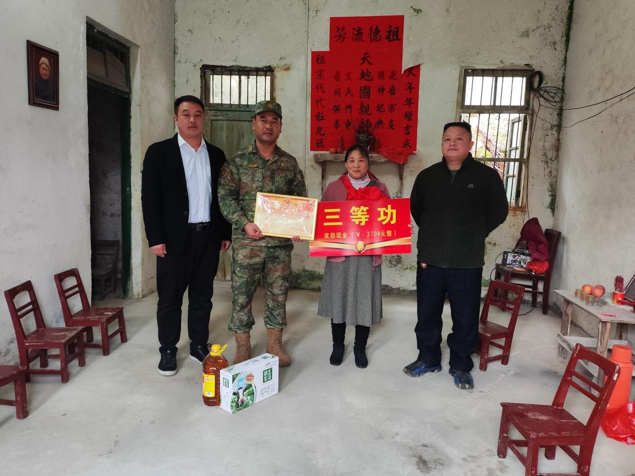 到白石乡三友村委现役军人唐吉中家中送立功喜报