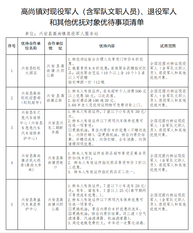 高尚镇优待证关联优待事项清单