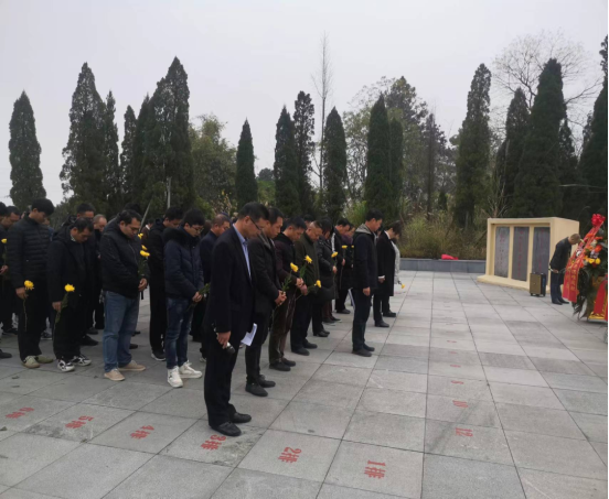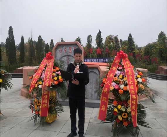 上午九时,光华铺阻击战旧址内,松柏苍翠挺拔,气氛庄严肃穆。伴随着国歌的响起,全体人员整齐肃立,向南京大屠杀遇难同胞沉痛默哀。最后,全体人员依次瞻仰革命烈士墓并敬献鲜花,沉痛悼念南京大屠杀死难同胞,深切缅怀革命烈士。