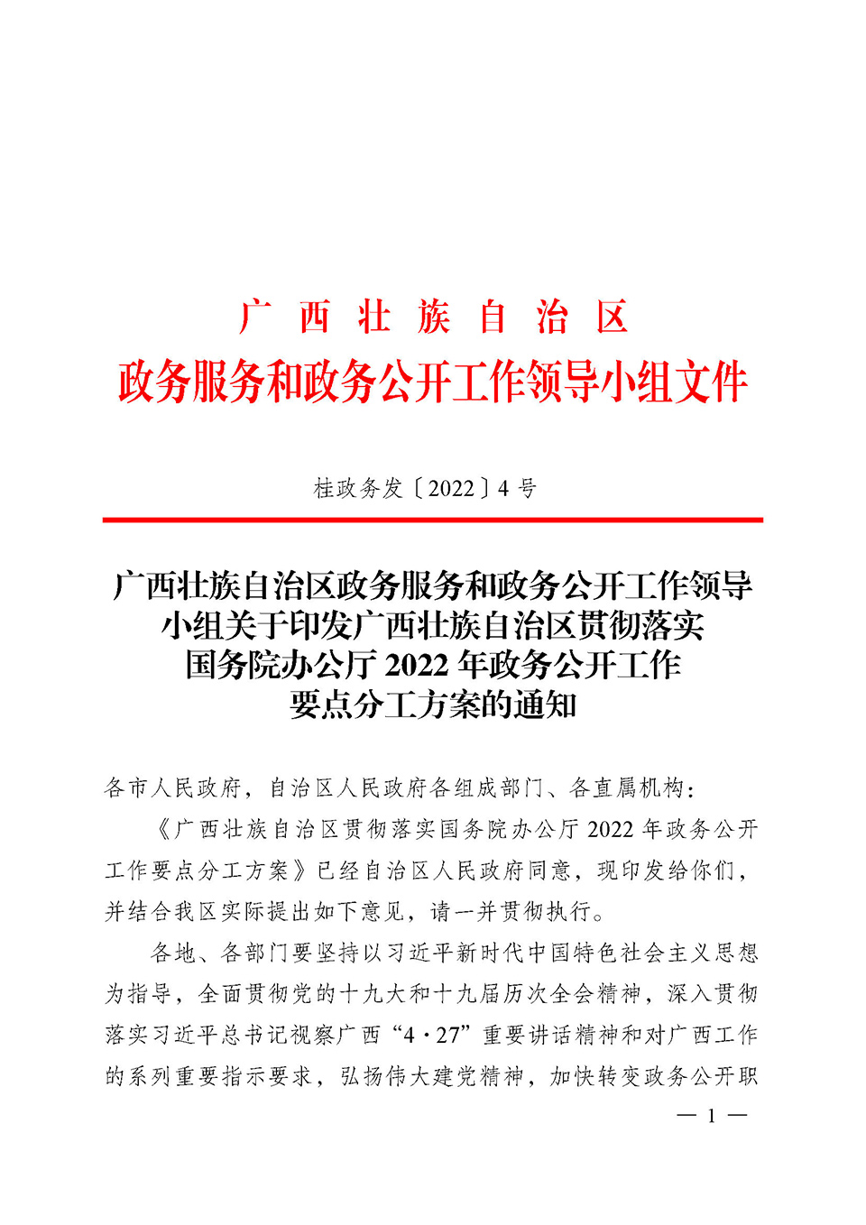 广西壮族自治区政务服务和政务公开工作领导小组关于印发广西壮族自治区贯彻落实国务院办公厅2022年政务公开工作要点分工方案的通知