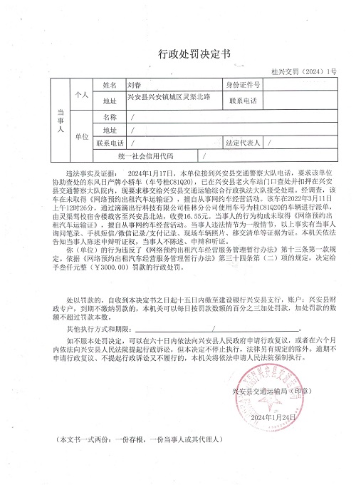 兴安县交通运输局行政处罚决定书(桂兴交罚字[2024]1号)