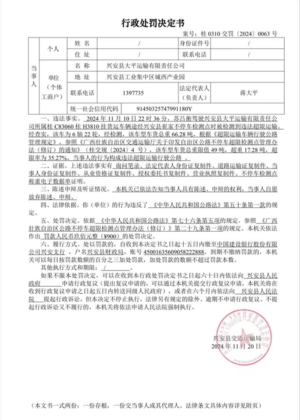兴安县交通运输局行政处罚决定书(桂0310交罚[2024]0063号)