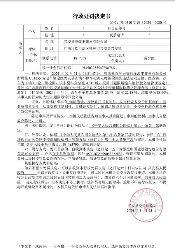 兴安县交通运输局行政处罚决定书(桂0310交罚[2024]0080号)