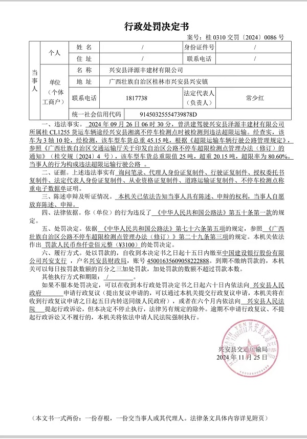 兴安县交通运输局行政处罚决定书(桂0310交罚[2024]0086号)