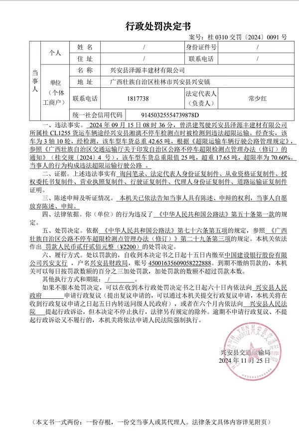 兴安县交通运输局行政处罚决定书(桂0310交罚[2024]0091号)