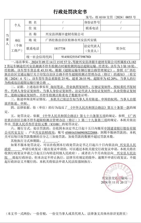 兴安县交通运输局行政处罚决定书(桂0310交罚[2024]0055号)