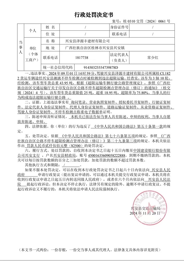 兴安县交通运输局行政处罚决定书(桂0310交罚[2024]0061号)