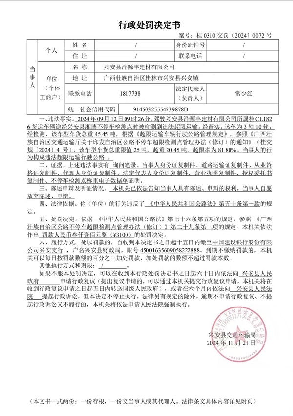 兴安县交通运输局行政处罚决定书(桂0310交罚[2024]0072号)