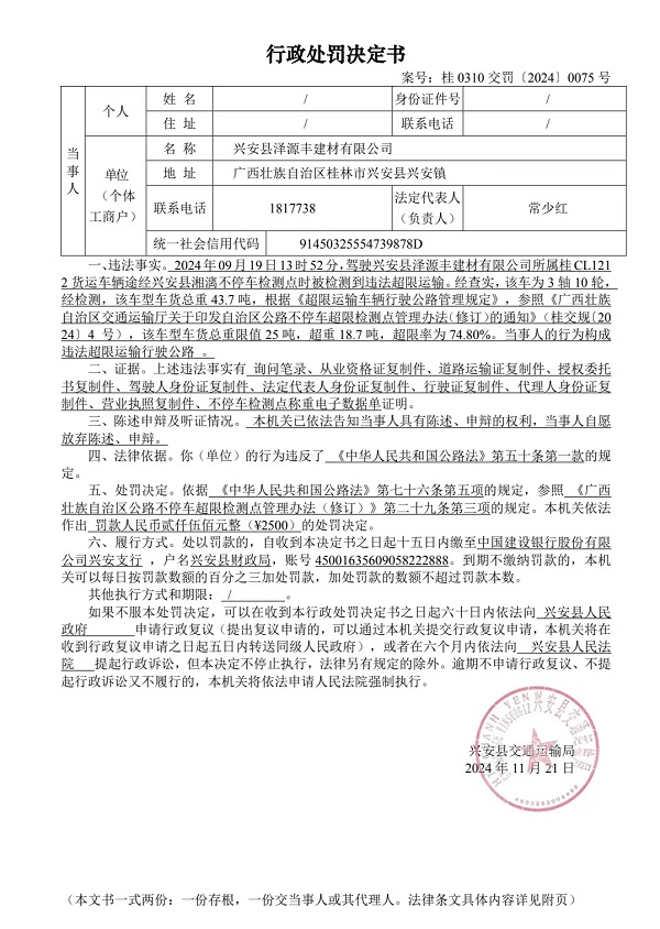 兴安县交通运输局行政处罚决定书(桂0310交罚[2024]0075号)