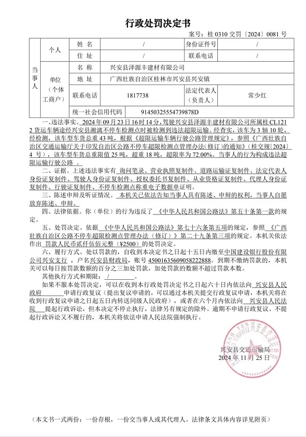 兴安县交通运输局行政处罚决定书(桂0310交罚[2024]0081号)