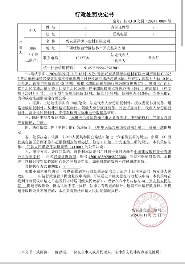 兴安县交通运输局行政处罚决定书(桂0310交罚[2024]0084号)