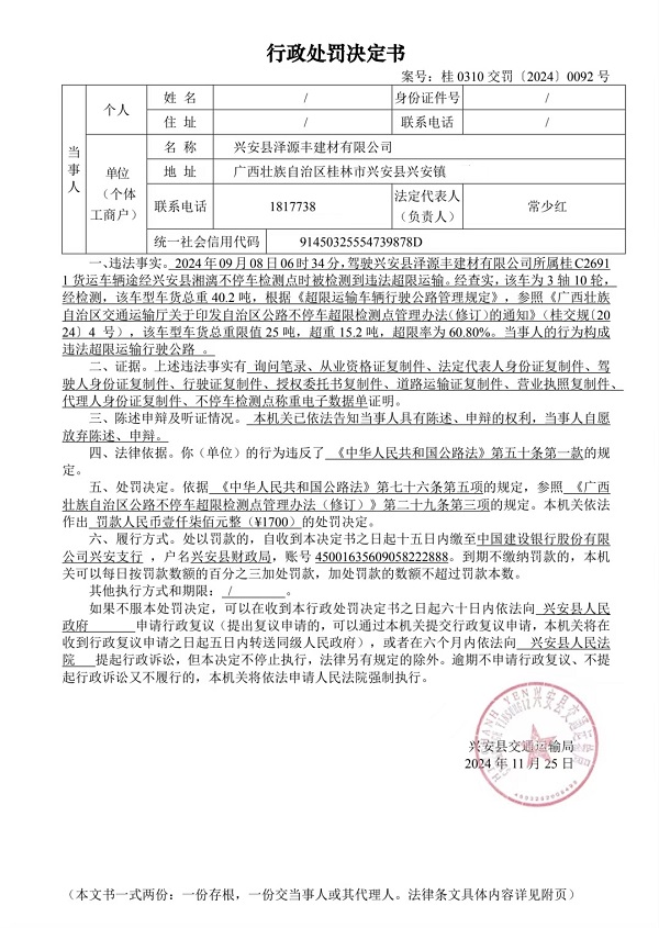 兴安县交通运输局行政处罚决定书(桂0310交罚[2024]0092号)